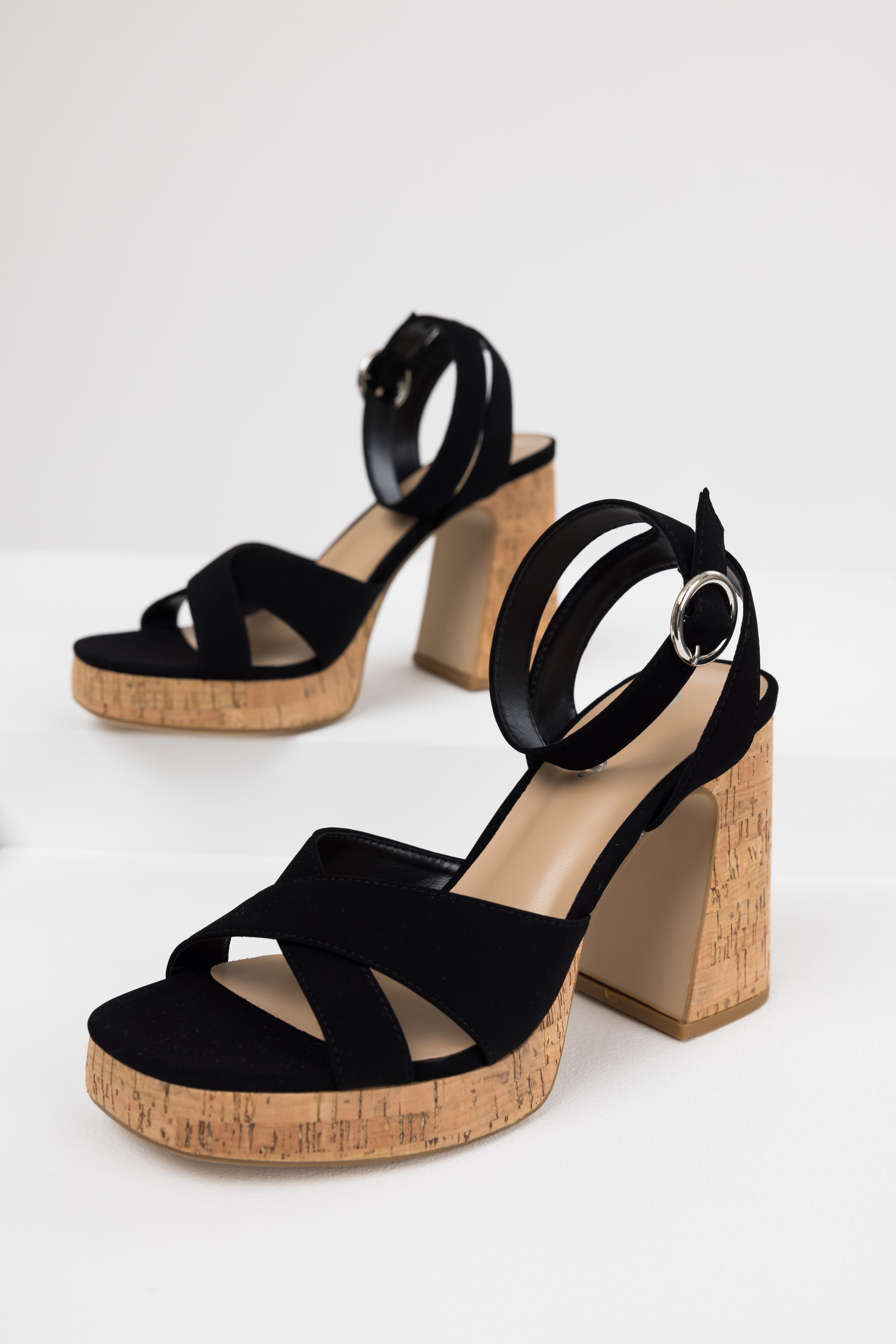 Black Ankle Strap Cork Platform Heels
