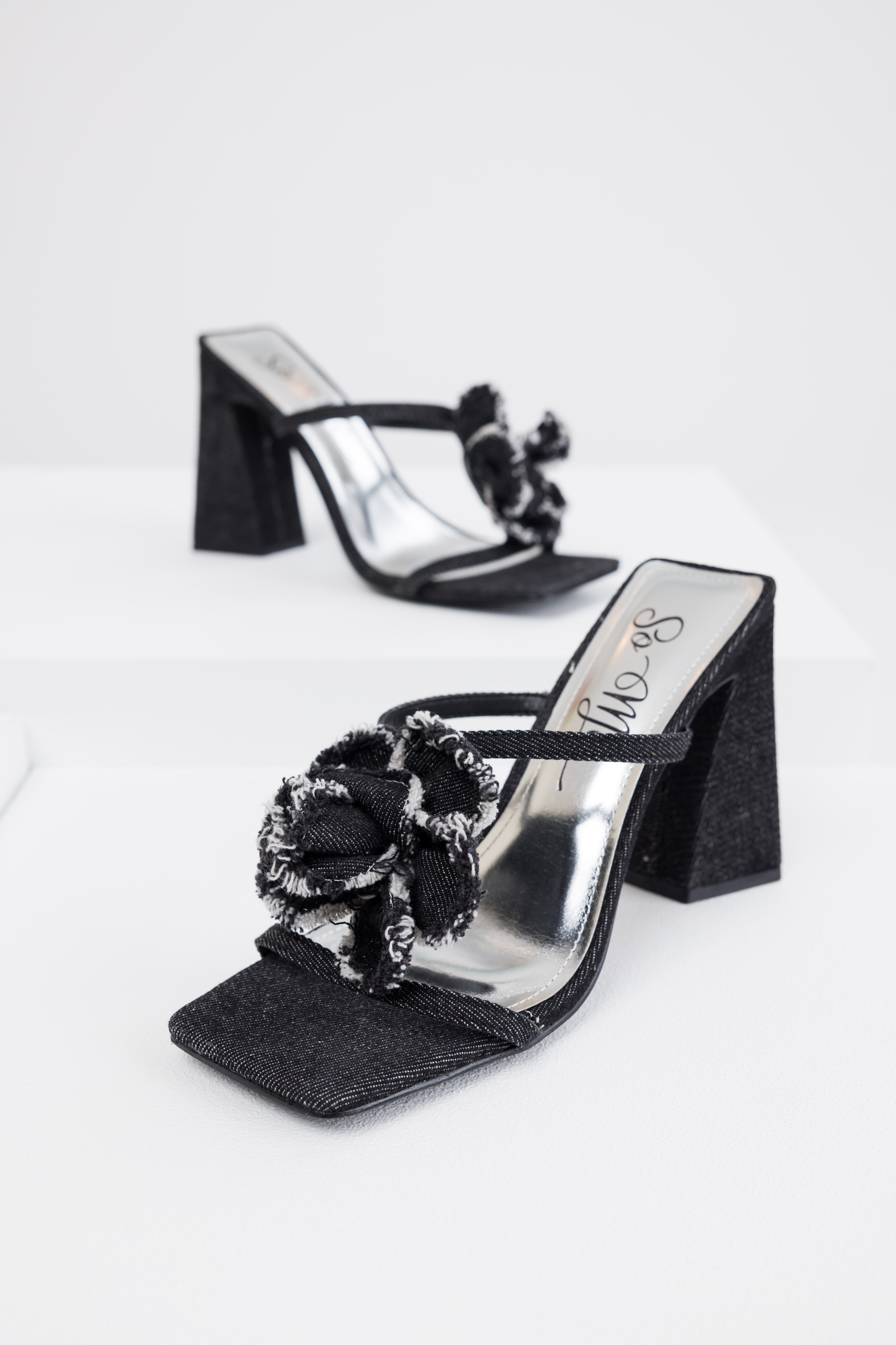 Black Denim Flower Detail Square Toe Heels