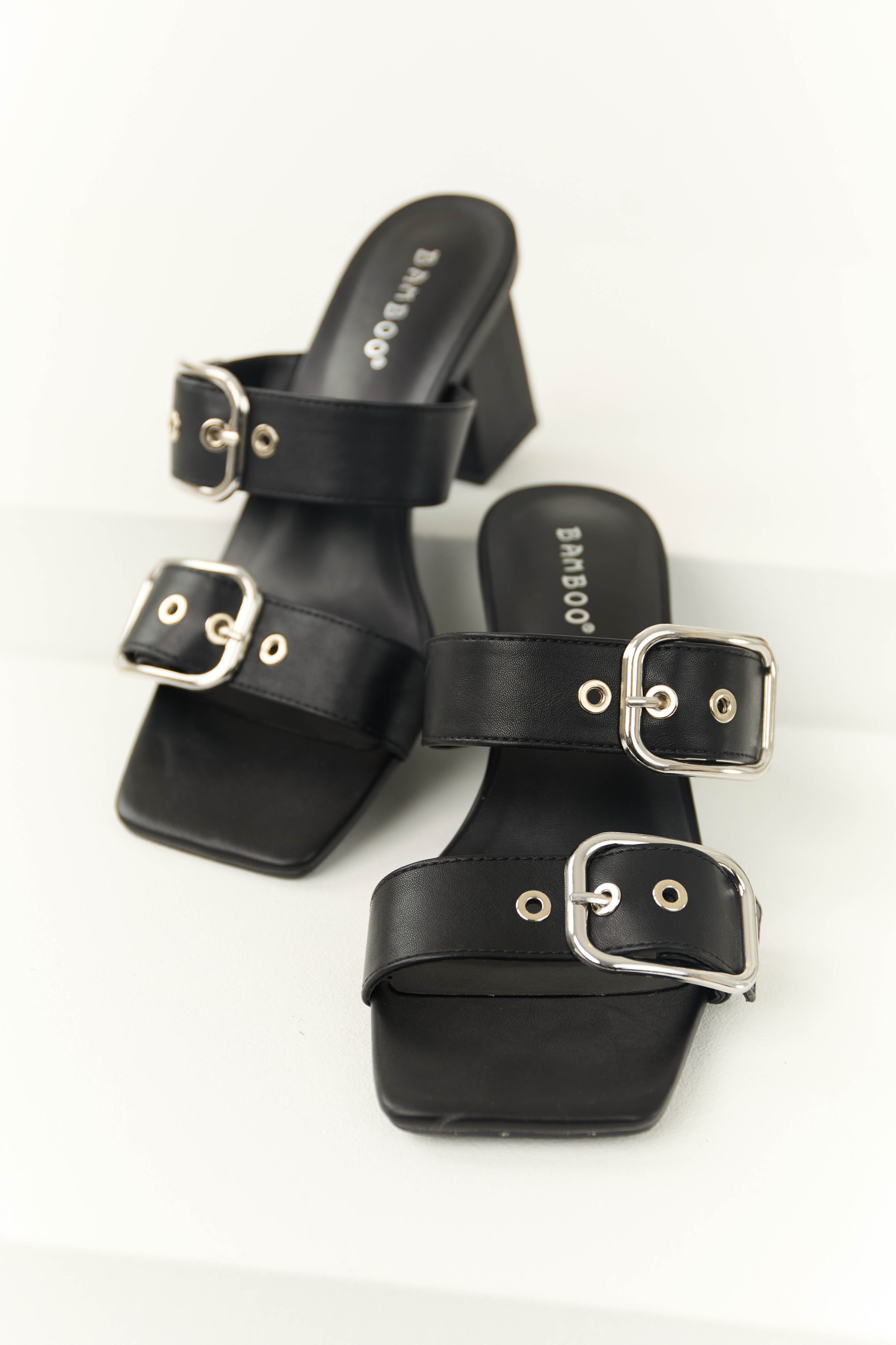 Black Faux Leather Square Toe Double Strap Heels