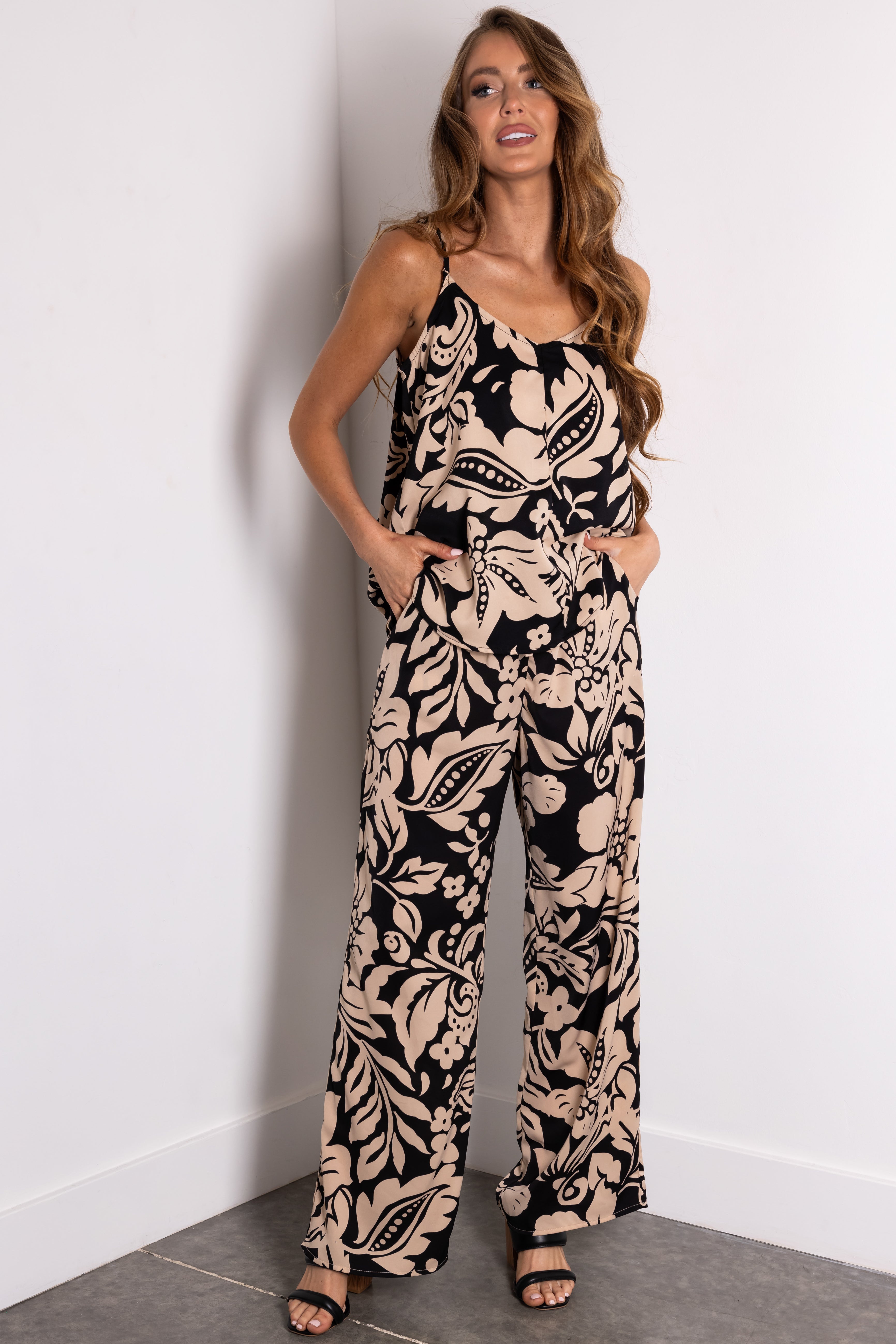 Black and Beige Floral Print Wide Leg Pants