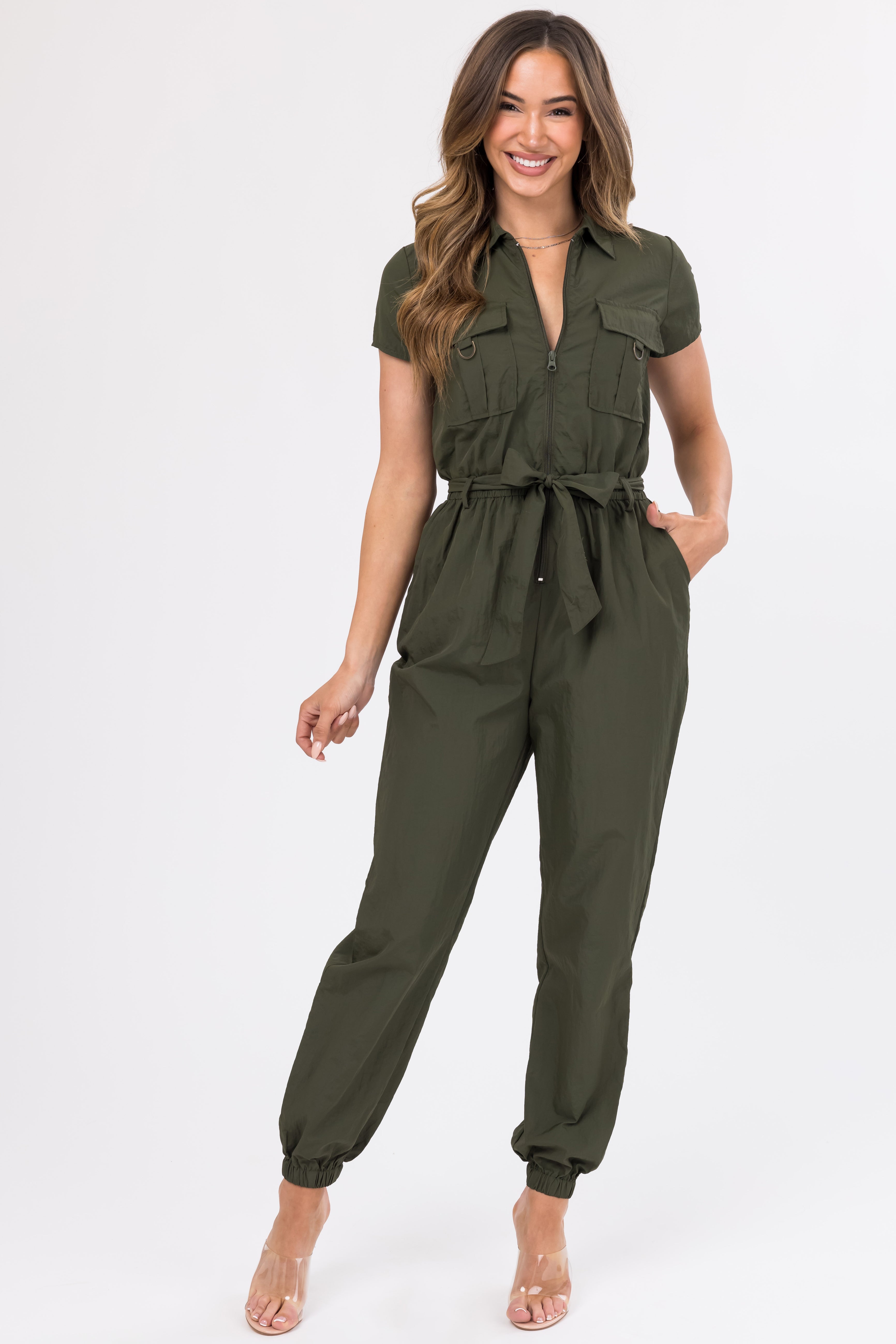 Army Green Zip Up Waist Tie Collared Jumpsuit
