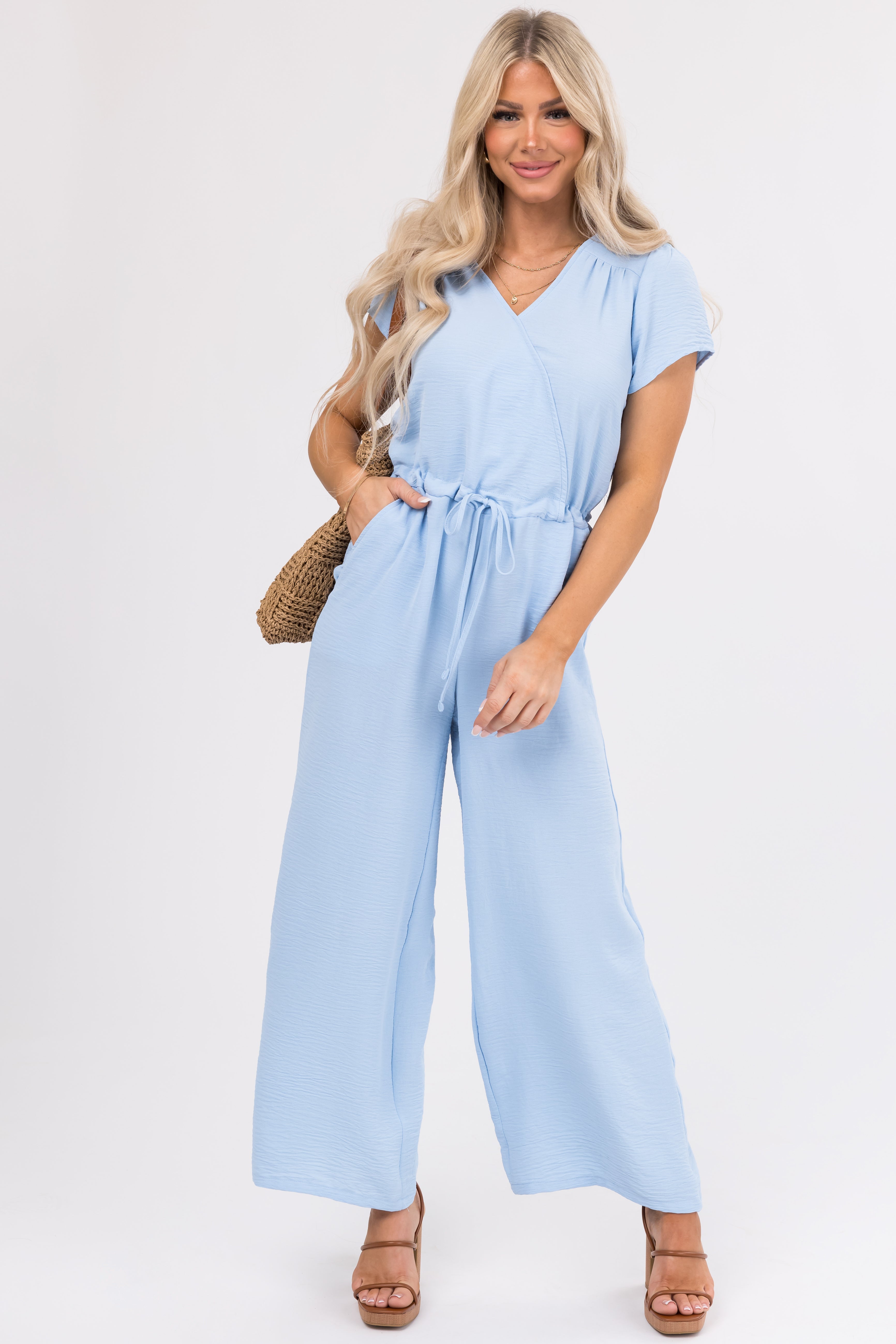 Baby Blue Surplice Wide Leg Crinkle Jumpsuit