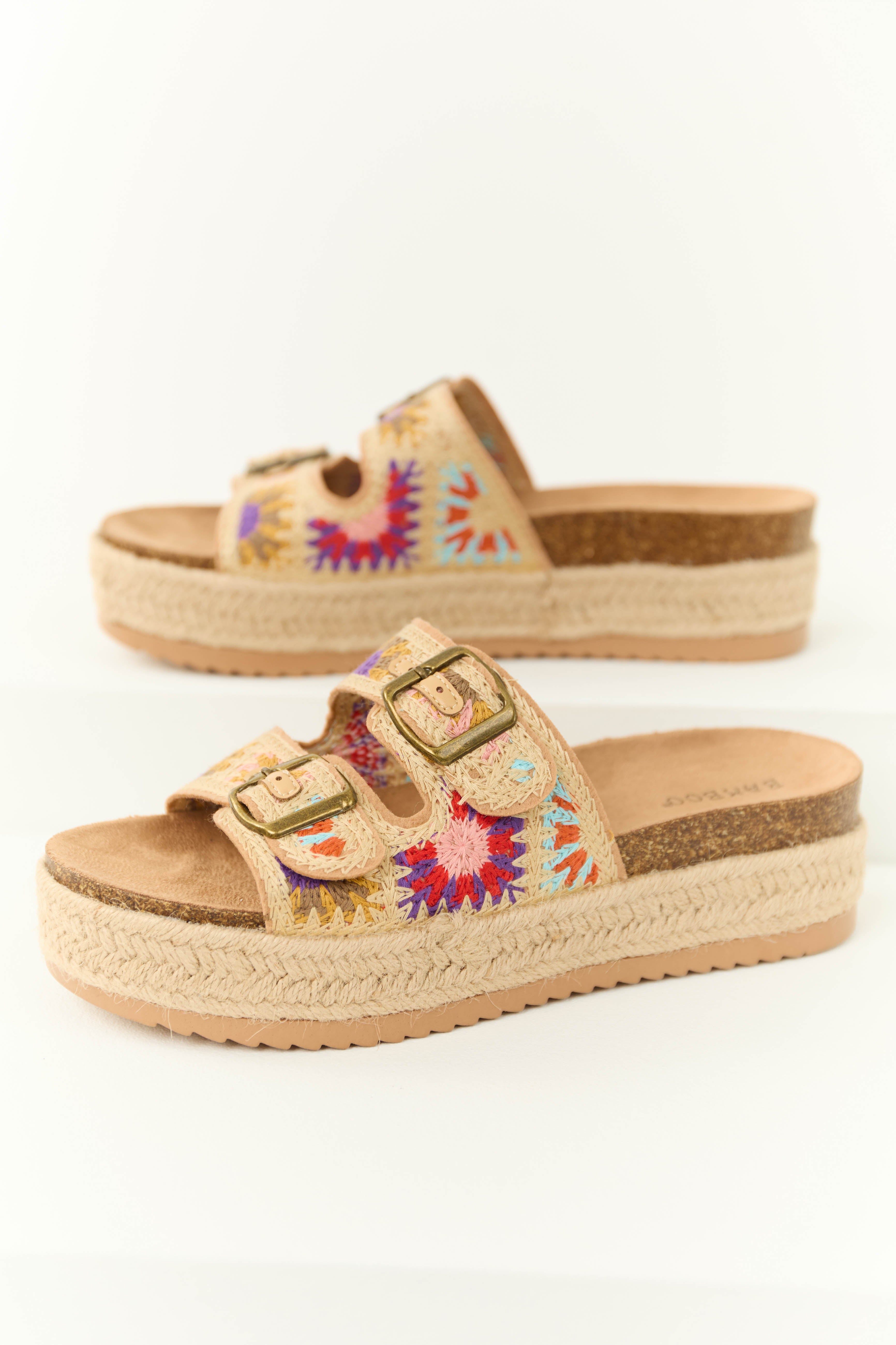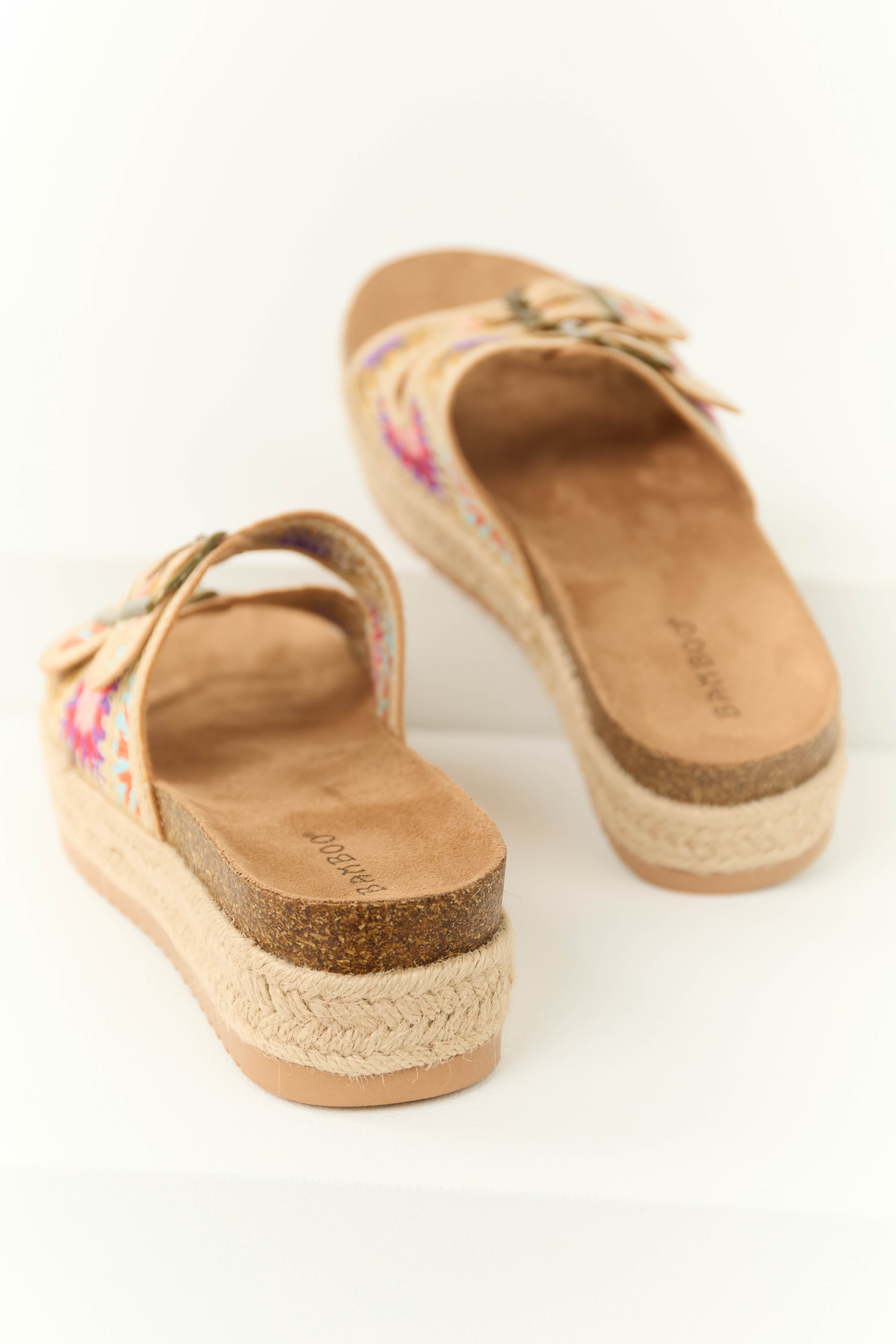 Beige Embroidered Woven Platform Buckle Sandal
