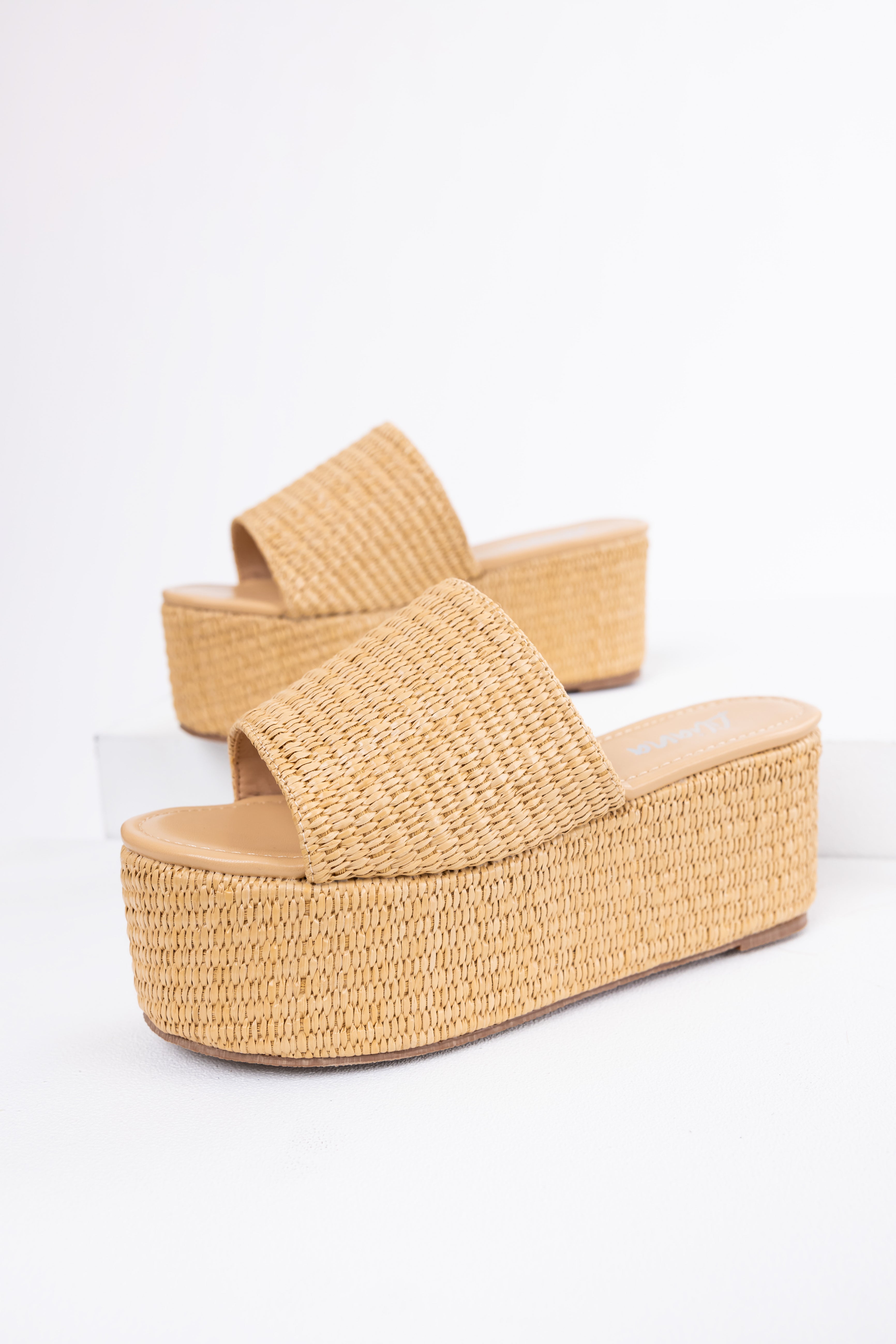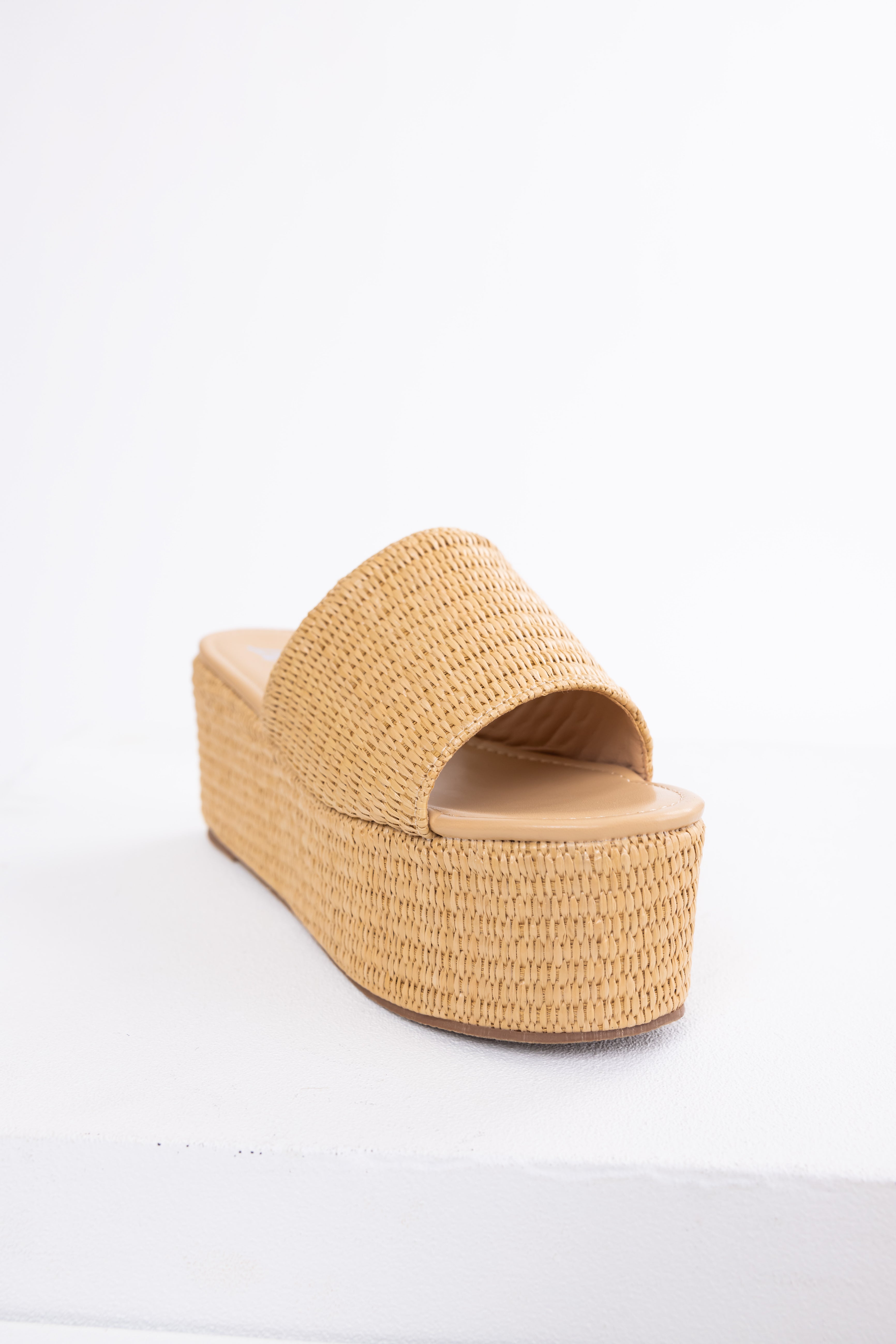 Beige Raffia Woven Platform Slide Sandals