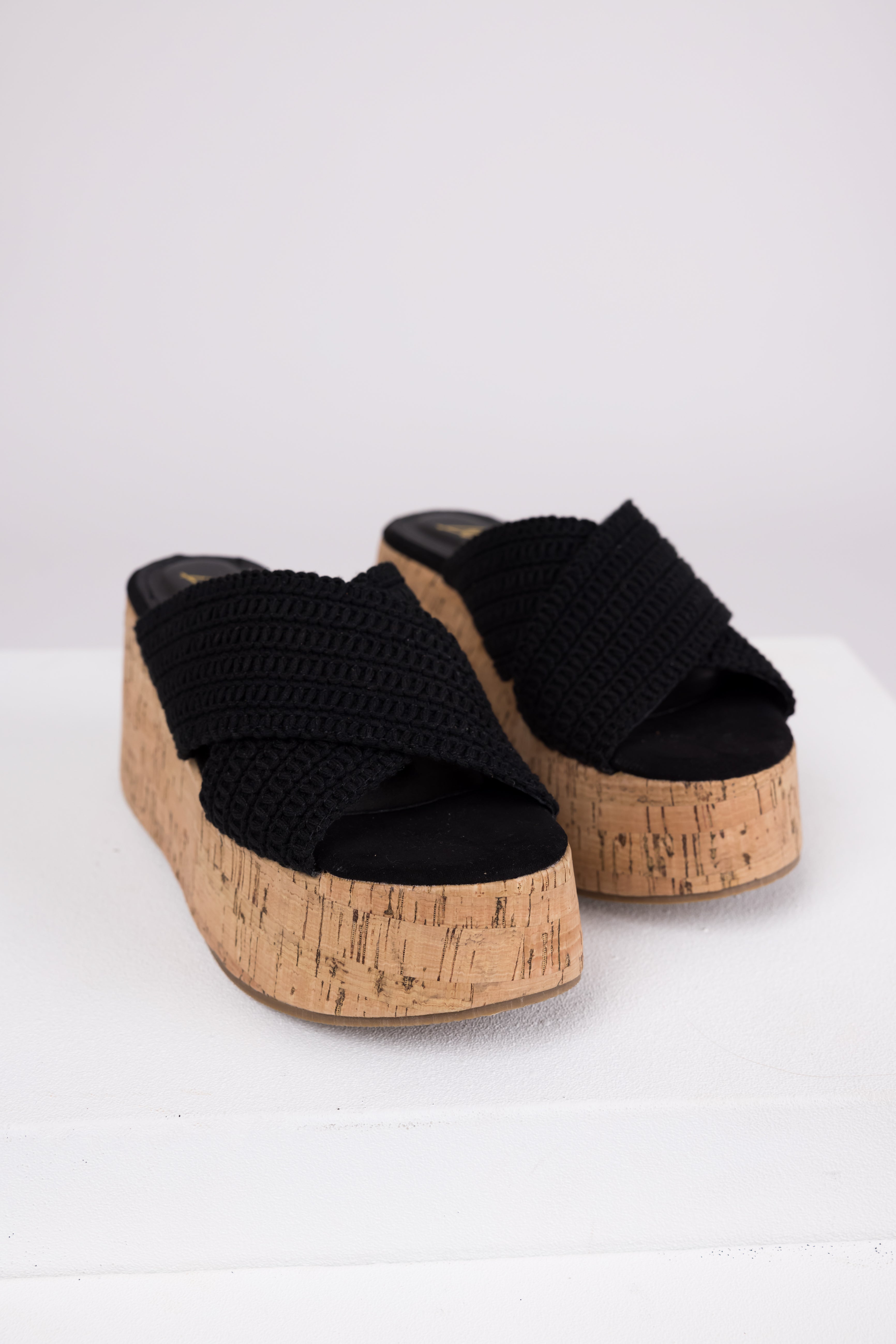 Black Crochet Cross Strap Cork Platform Wedges