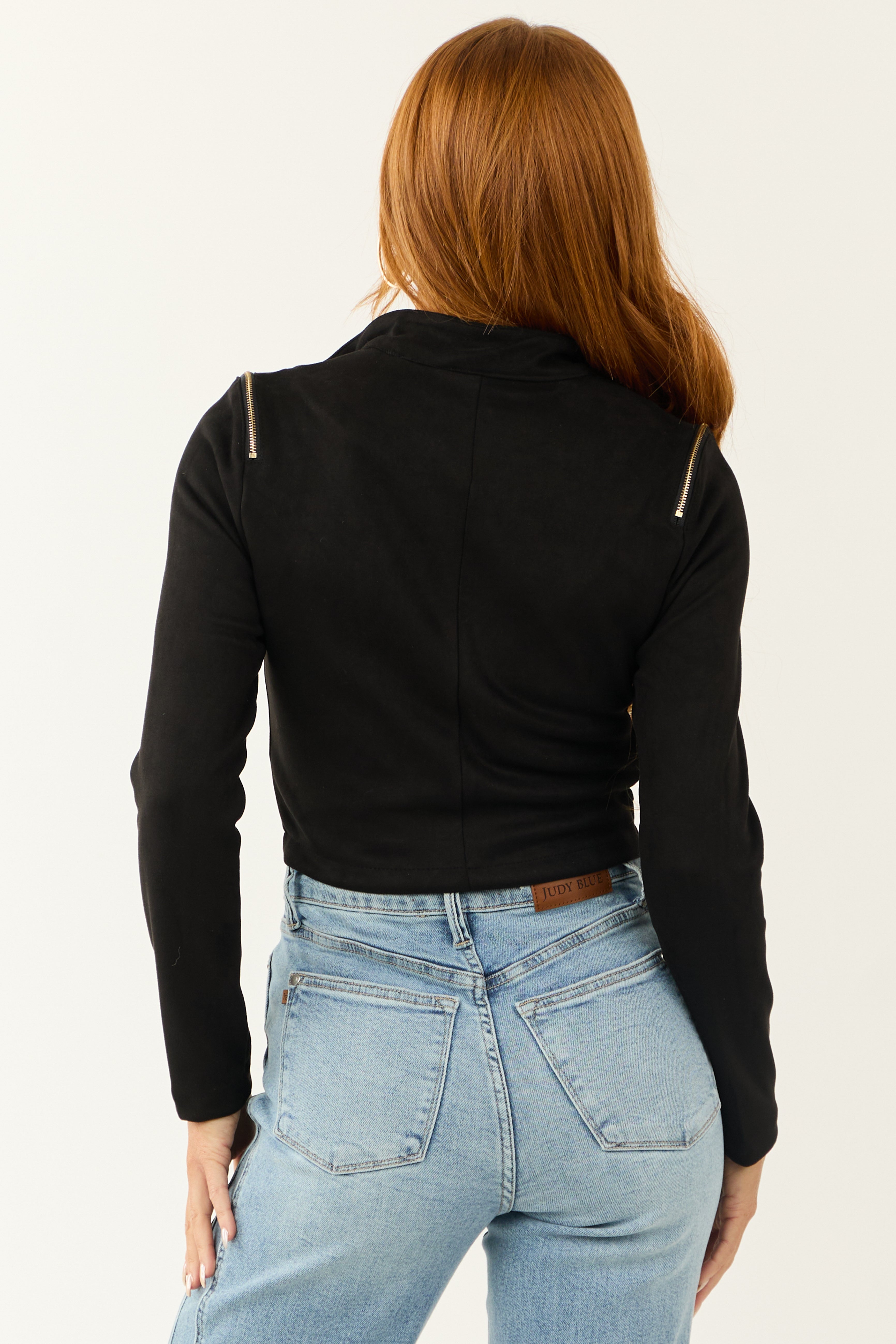 - Mock neckline with two snap closures