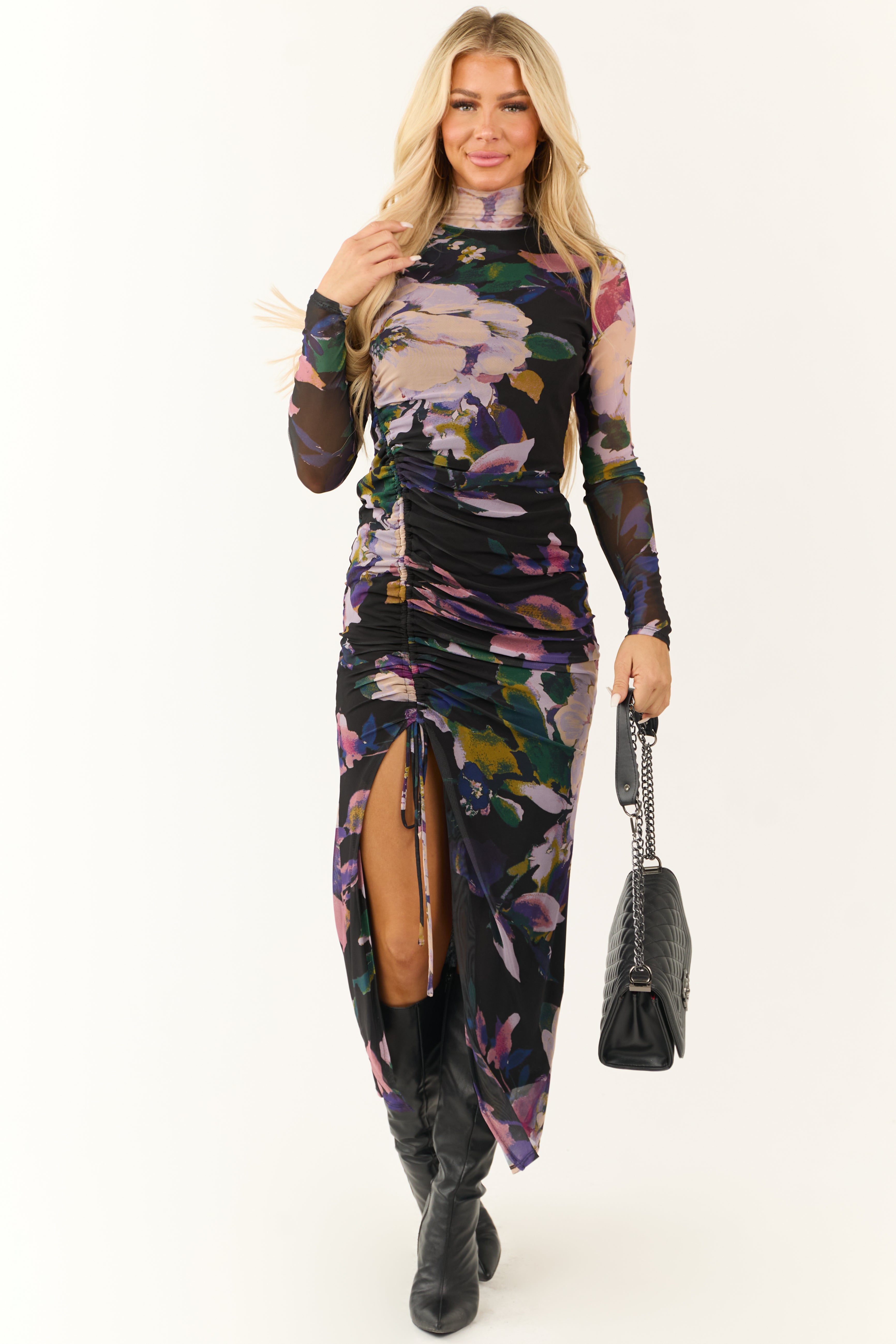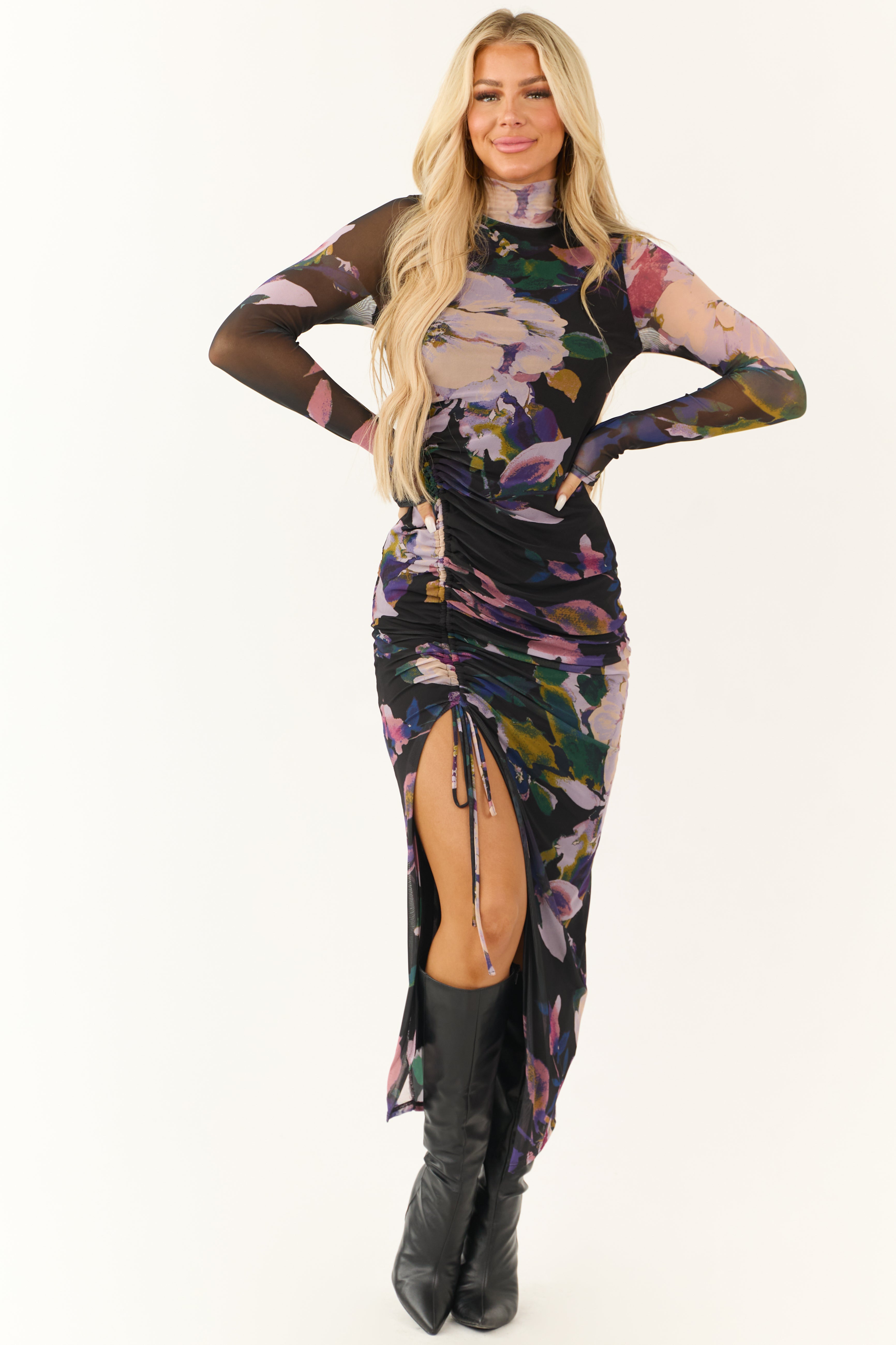 - Ruched side with tie closure