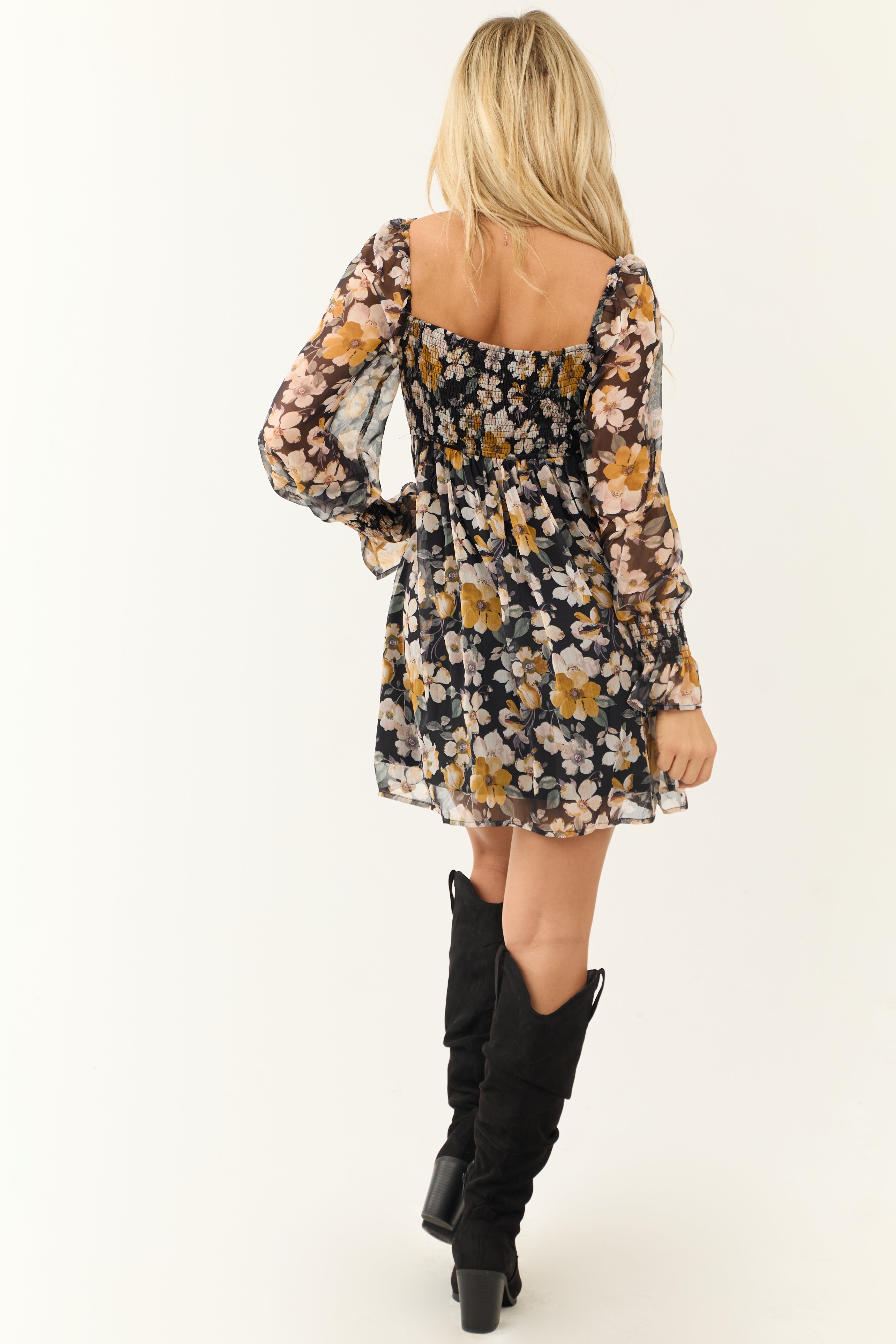 - Floral print in the shades of Black. Coconut. Juniper. Marigold. Mustard. and Ivory