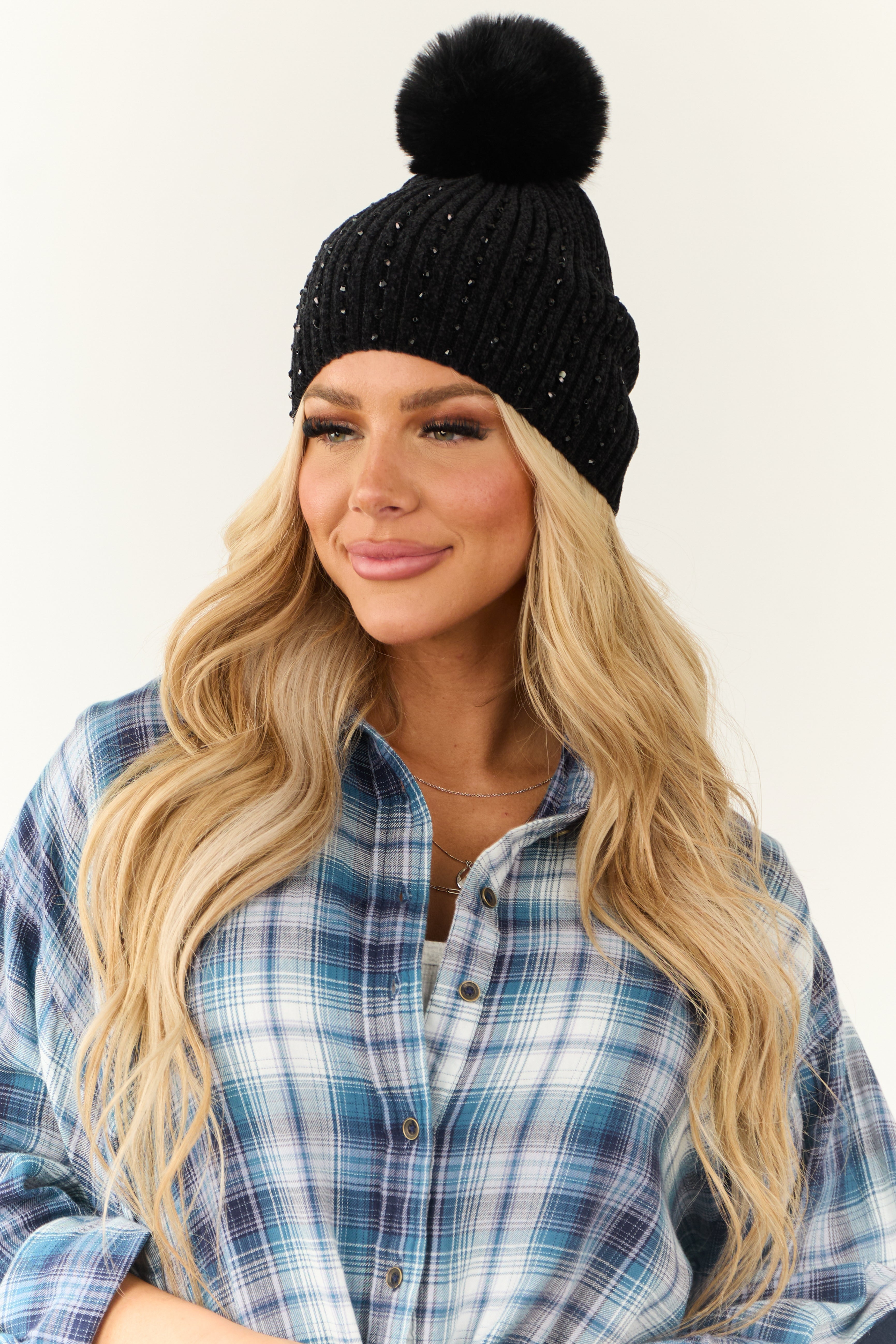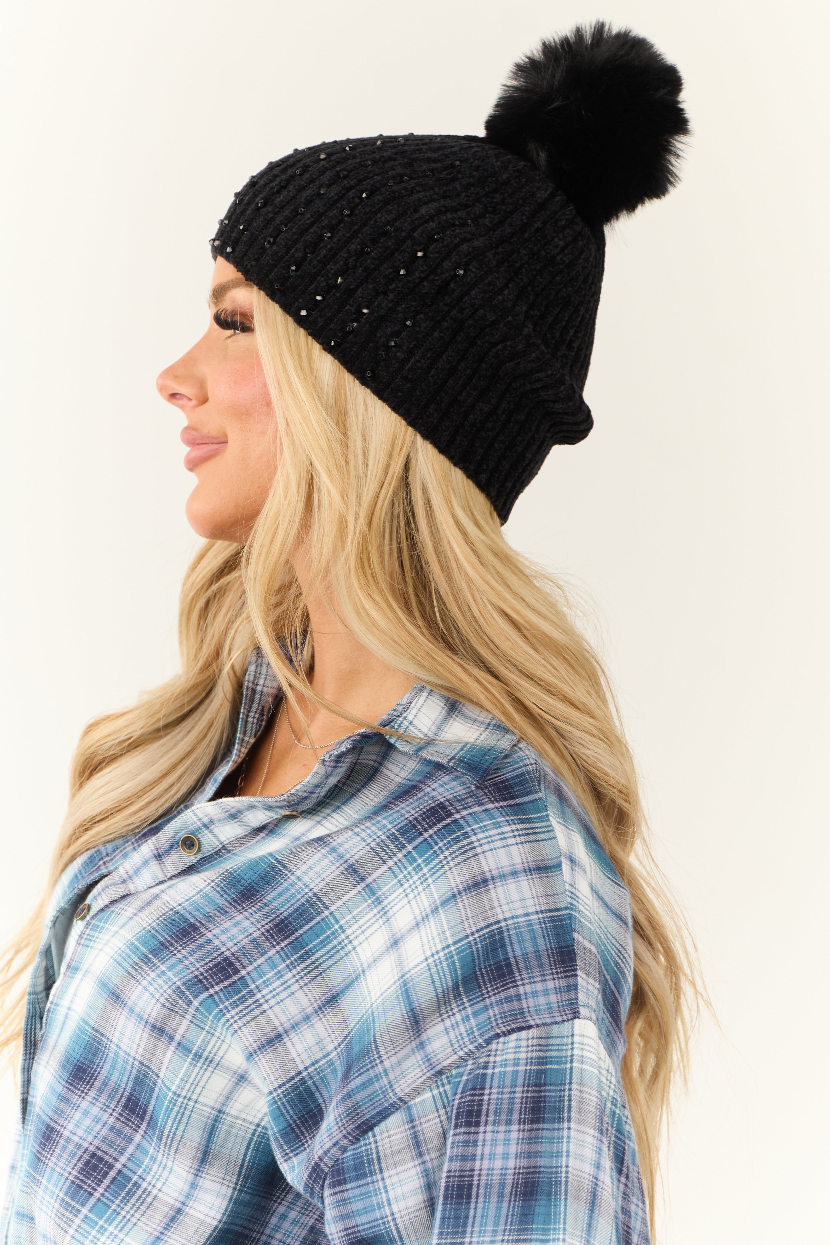 Black Gemstone Embellished Chenille Pom Pom Beanie