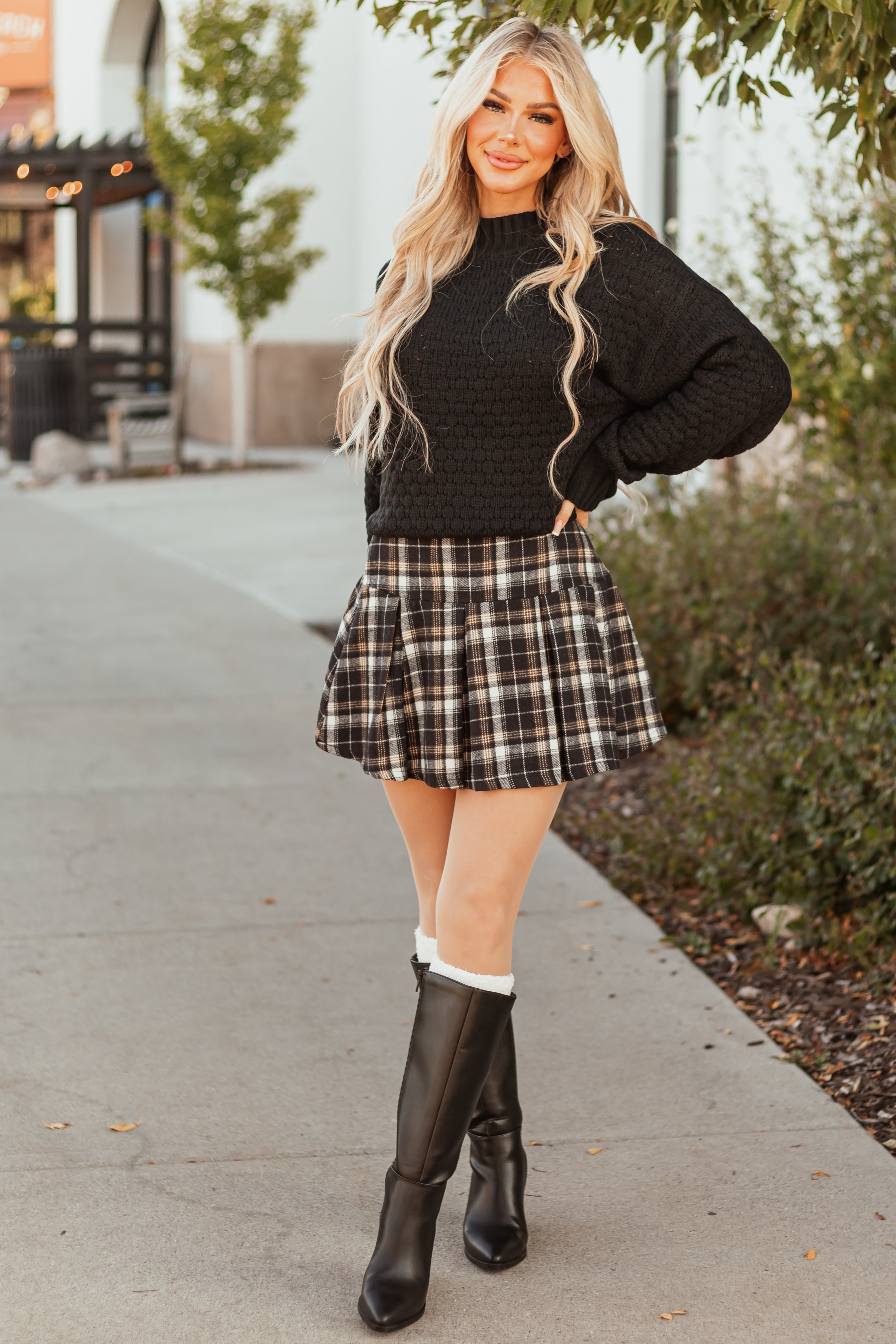 - Plaid in the shades of Black. Ivory. and Peanut