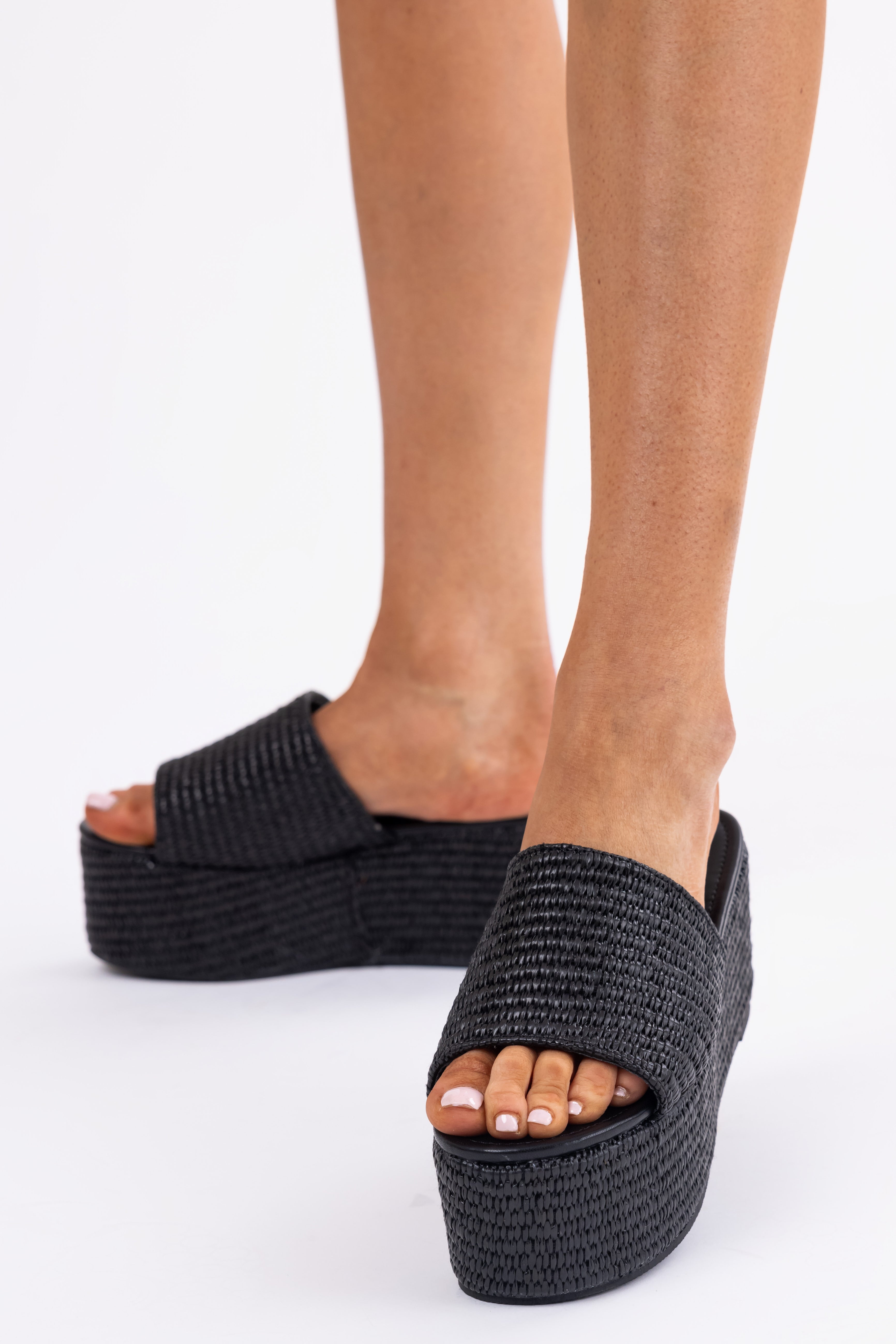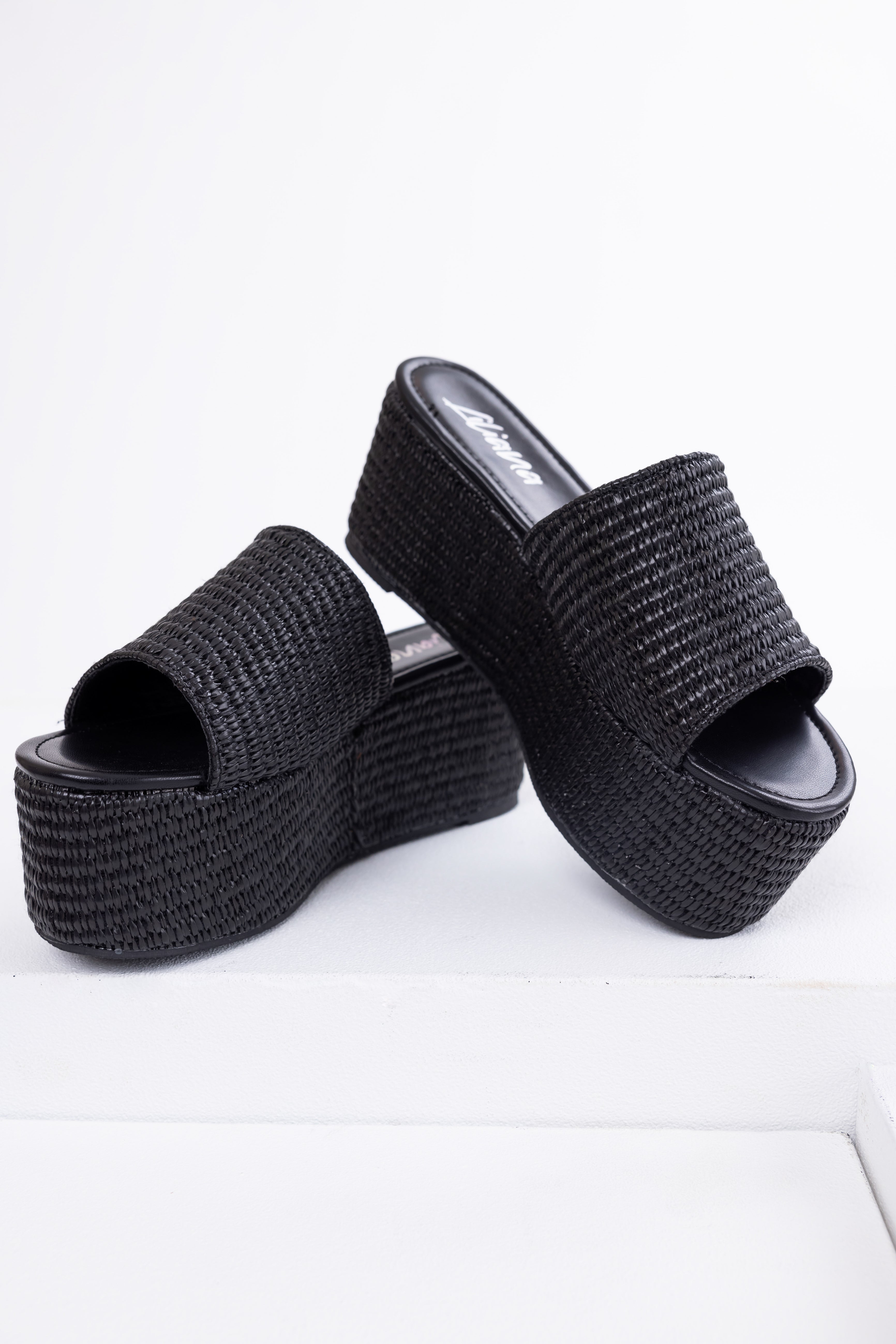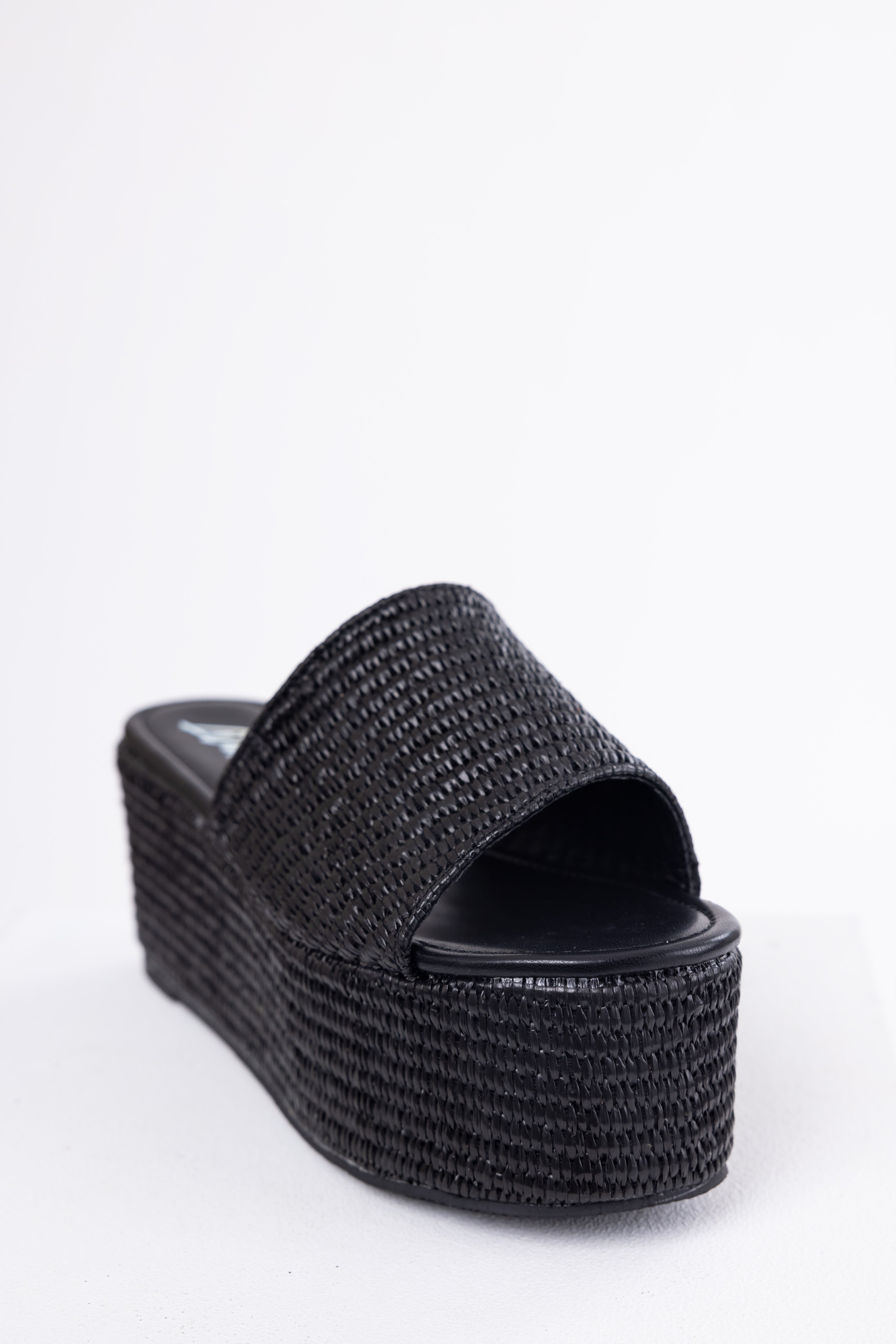 Black Raffia Woven Platform Slide Sandals