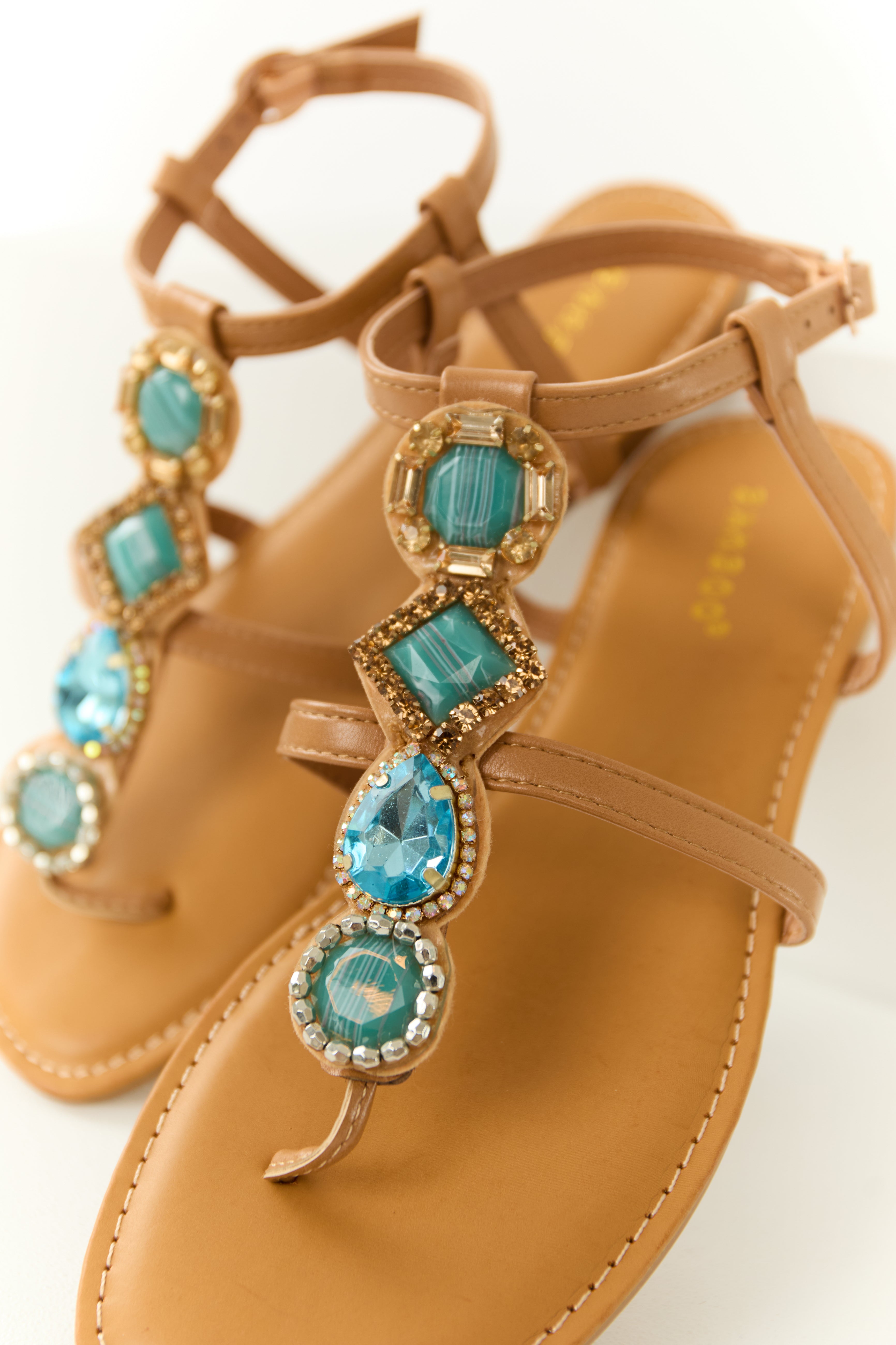 Brown Sugar Thong Sandals with Teal Rhinestone Strap